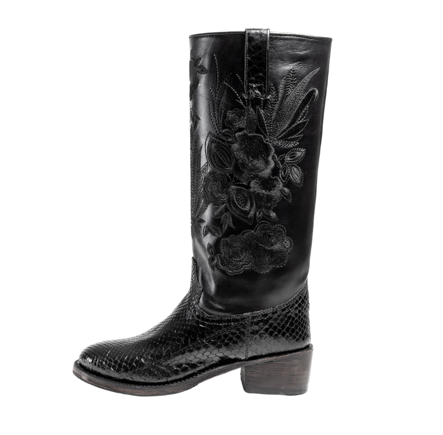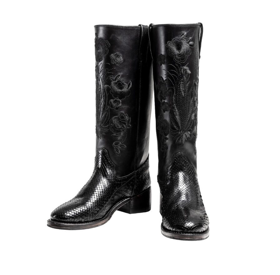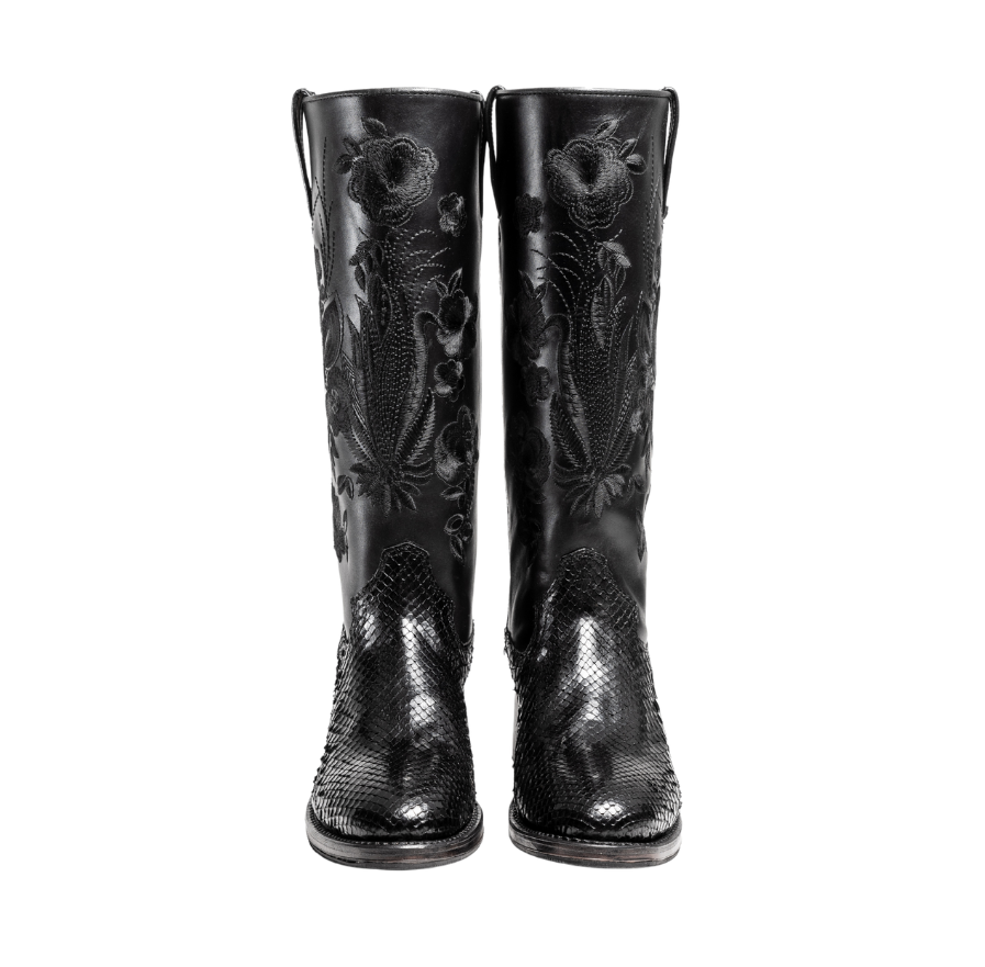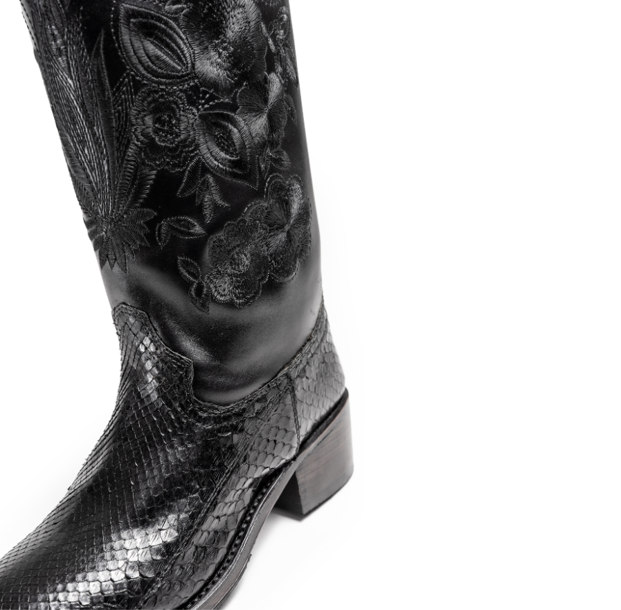 Eine meisterhafte Verbindung aus traditioneller Haut und der Raffinesse von exotischem Python. Da es sich um echte Naturmaterialien handelt, besitzt jeder Stiefel eine eigene, unwiederholbare Identität: Die natürliche Anordnung der Schuppen garantiert, dass kein Paar dem anderen gleicht. Ein organisches, elegantes und zutiefst exklusives Designobjekt.