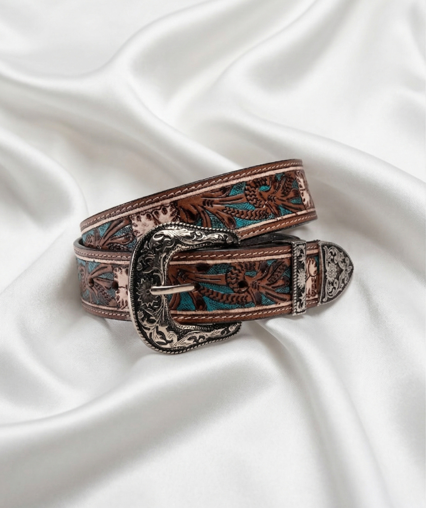 Der Gürtel, der für sich selbst spricht. Der handgefertigte Ledergürtel von Tony Mora ref. 4005 ist ein einzigartiges Stück, das in aufwändiger Handarbeit auf Mallorca aus hochwertigem doppellagigem Echtleder gefertigt wird. Markante Türkis-Details kombiniert mit dekorativen Western-Prägungen erzeugen einen auffälligen und zugleich eleganten Kontrast, der jedem Outfit sofort das gewisse Etwas verleiht — mit jener mühelosen Ausstrahlung, die nur echtes Kunsthandwerk bieten kann.